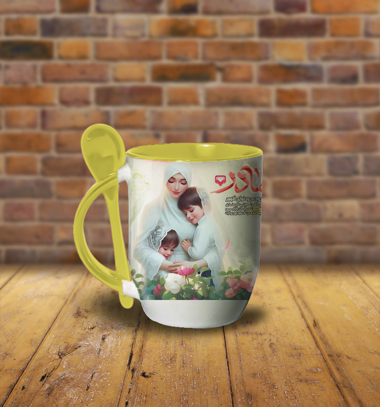چاپ ماگ قاشق دار با طرح دلخواه شما داخل رنگ زرد